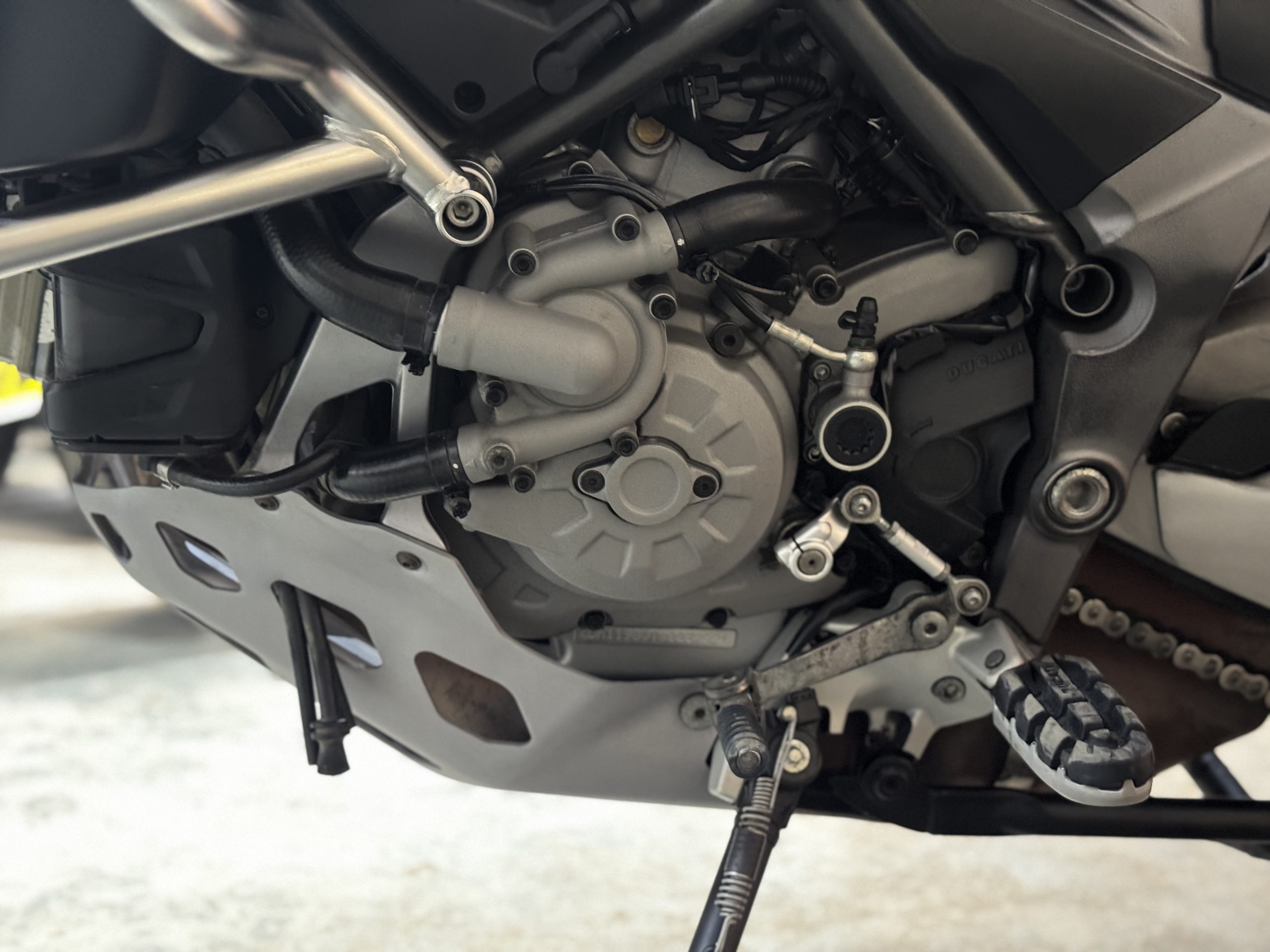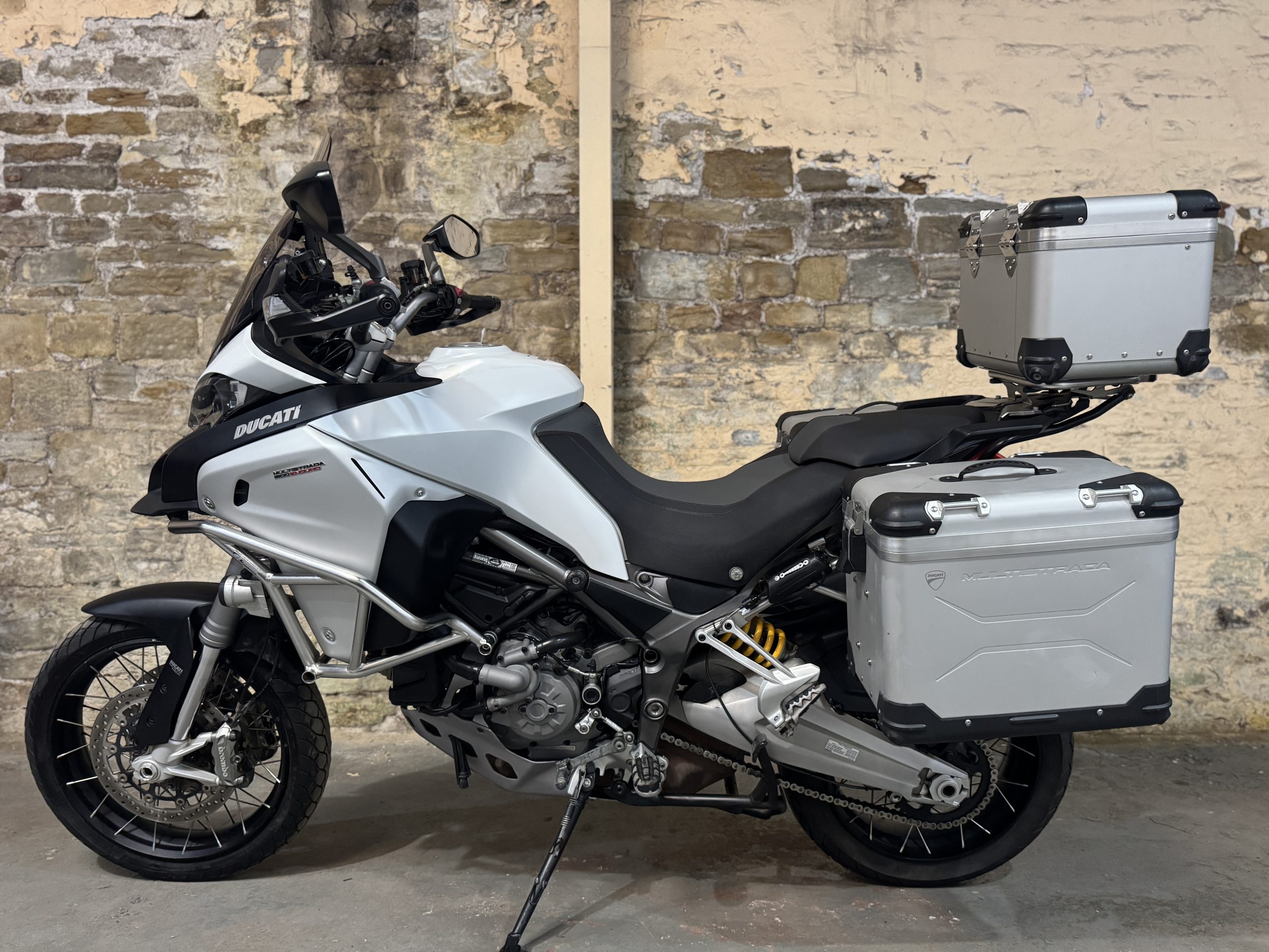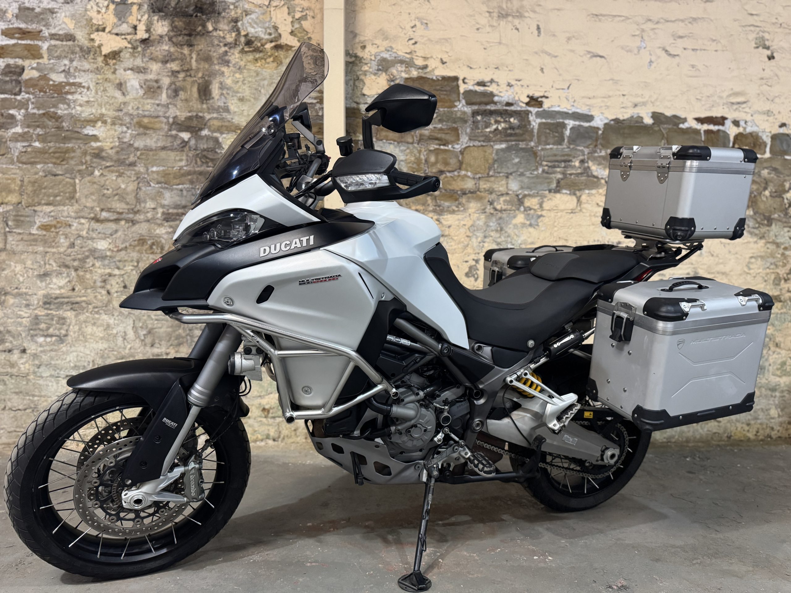 A really nice example of the top spec edition from Ducati, with a full complement of electronics including Skyhook suspension, various power modes for terrain, Brembo brakes, ABS and cruise as well as centre stand and off road footpegs. This bike has also been fitted with the Ducati aluminium monokey luggage set, plus spots, bash plate, crash bars and an essential Evotech rad guard (for those who want to venture off tarmac!). It also has a taller screen, heated grips and keyless ride…You can’t ask for more!